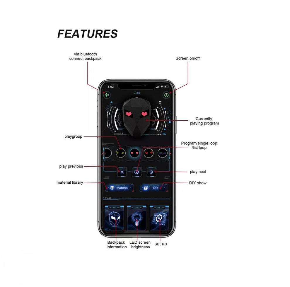 Experience a unique way to express your creativity with our LED smart backpack. With an impressive cool design, it can be easily spotted in a crowd and perfect for various scenarios including motor sports, travelling, hiking, cycling or outdoor sports.